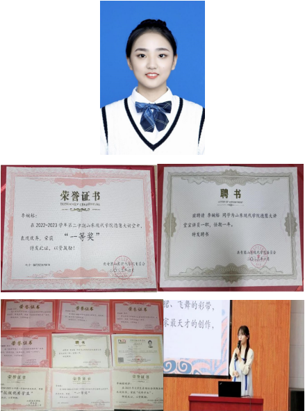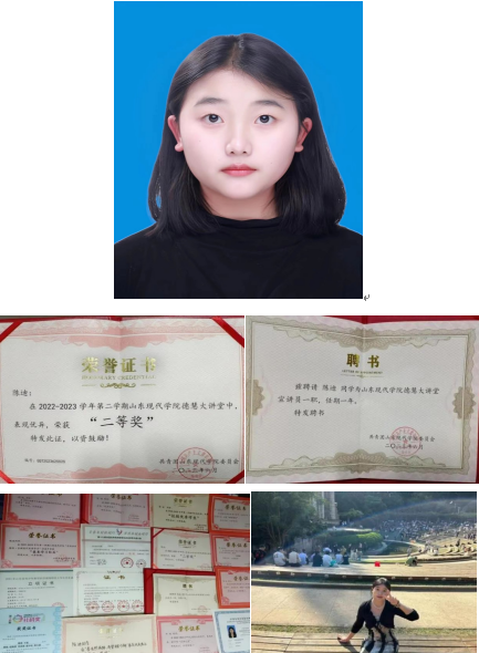 个人简介:李婉榕,女,汉族,共青团员,2022级本科财务管理1班。学习上勤奋努力,成绩名列前茅,积极参加各类比赛活动,曾获得“2022-2023学年第二学期山东现代学院德慧大讲堂”一等奖、2023年山东省青少年教育科学规划项目大学生学术课题立项证书、“和谐校园·温馨寝室”征文比赛三等奖、“校级优秀学生”等荣誉。