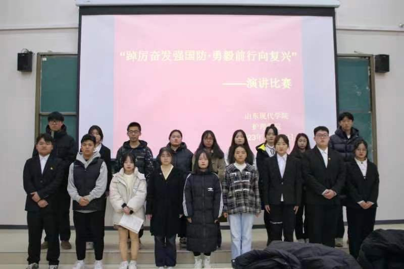 “青年强,则国家强”。为弘扬爱国主义精神,培养全民国防意识,培养新时代大学生的国防观念和家国情怀,提高大学生对国防安全的认识,由共青团山东现代学院委员会主办,护理学院团总支承办的“踔厉奋发强国防·勇毅前行向复兴”演讲比赛于12月10日在博学楼102室举办。