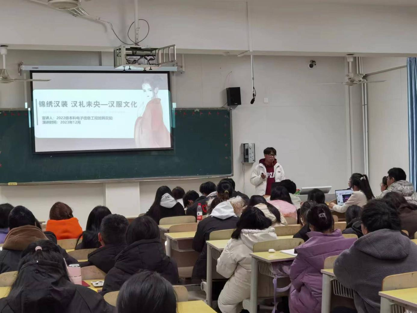 2022级本科电子信息工程班韩奕阳以“锦绣汉装,汉礼未央”为主题,向同学们分享了汉服的演变与发展,并展示了行走、鞠躬、拜礼等传统礼仪动作,同学们领略到了汉服文化中注重礼仪与仪态的精髓。