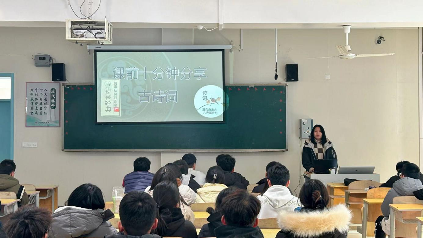 2023级本科数字媒体技术班的蔡玉杰为班级同学带来了精彩的古诗词赏析,从《登鹳雀楼》到《静夜思》,一首首经典诗篇引人入胜,同学们深刻体会到了诗人对大自然和生活的领悟。