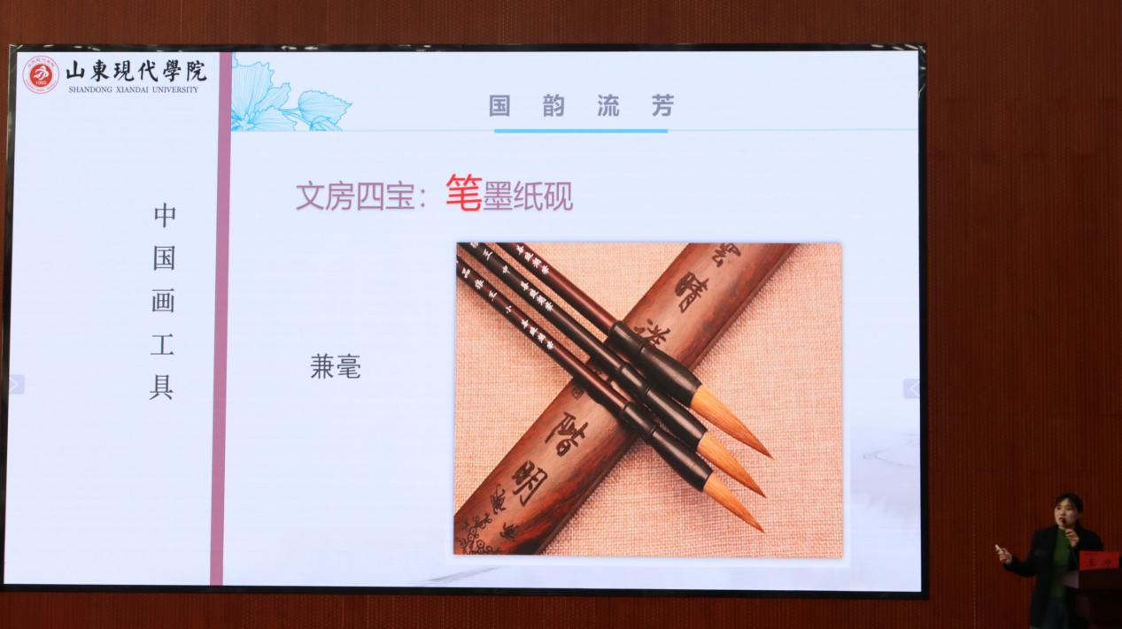 笔墨纸砚,乃文人墨客之良伴,亦传统书画之精髓。主讲老师对笔墨纸砚的种类,产地进行了详尽的介绍,并对中国画颜料的原材料及使用作了详细的说明。笔、墨、纸、砚,四种元素相互补充,共同构筑了中国传统绘画艺术的灿烂天地,见证了历史的变迁,承载了文化的传承。