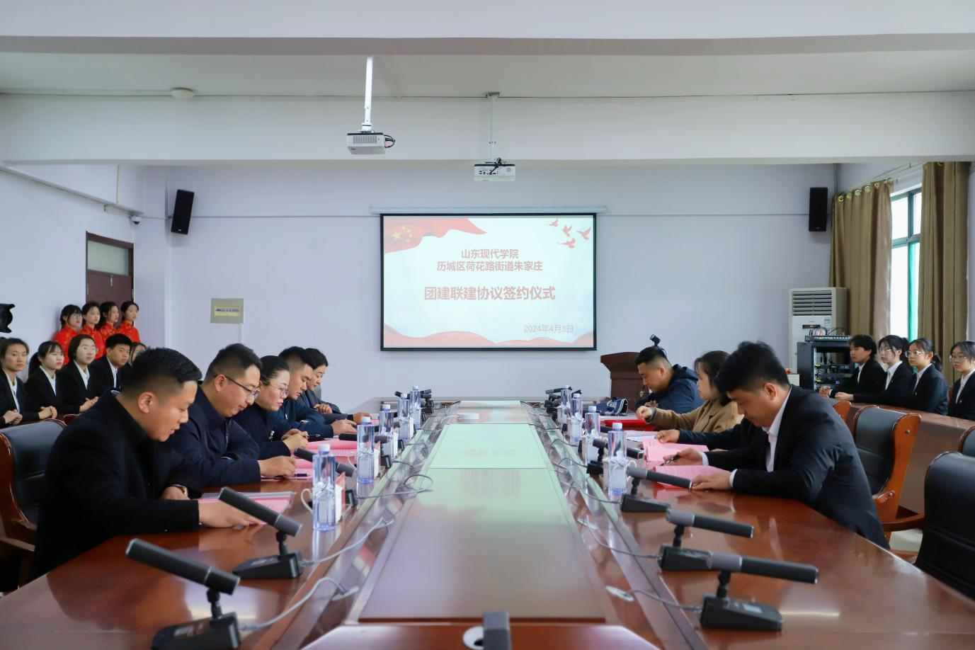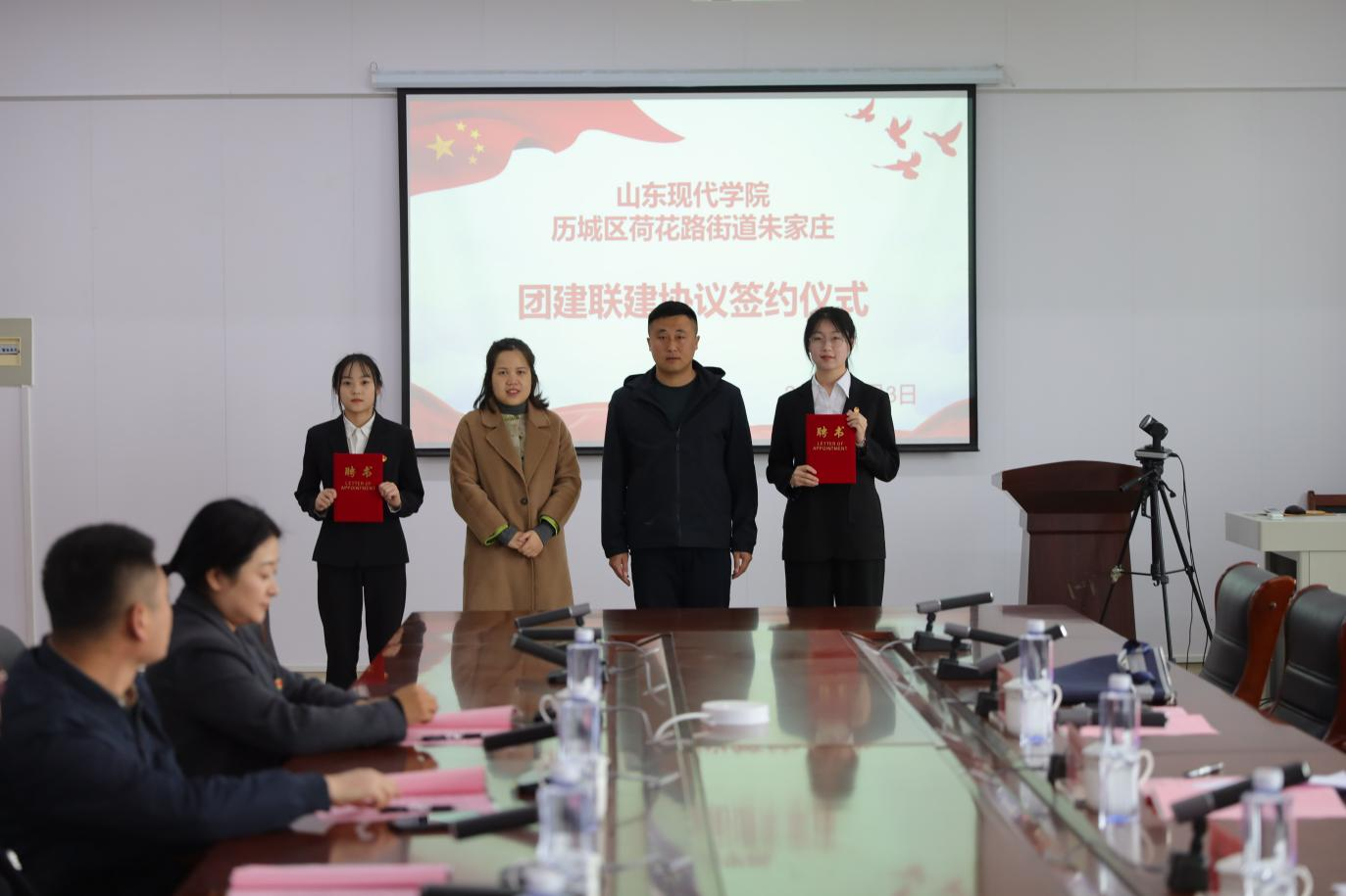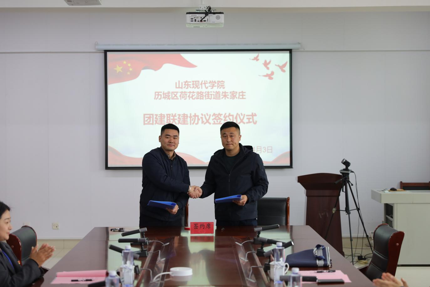 山东现代学院与历城区荷花路街道朱家庄团建联建协议签约仪式不仅有利于推动学校与村居的深度合作,为学生提供更多的实践平台,同时还可以促进新农村建设和社区发展以及文化的交流与传播。签约仪式上,双方团组织负责人还就共青团工作开展情况和青年发展等方面进行了交流,以期共同提升团建合作水平,推动团建工作不断迈向新台阶。