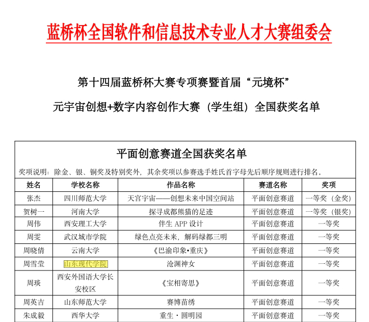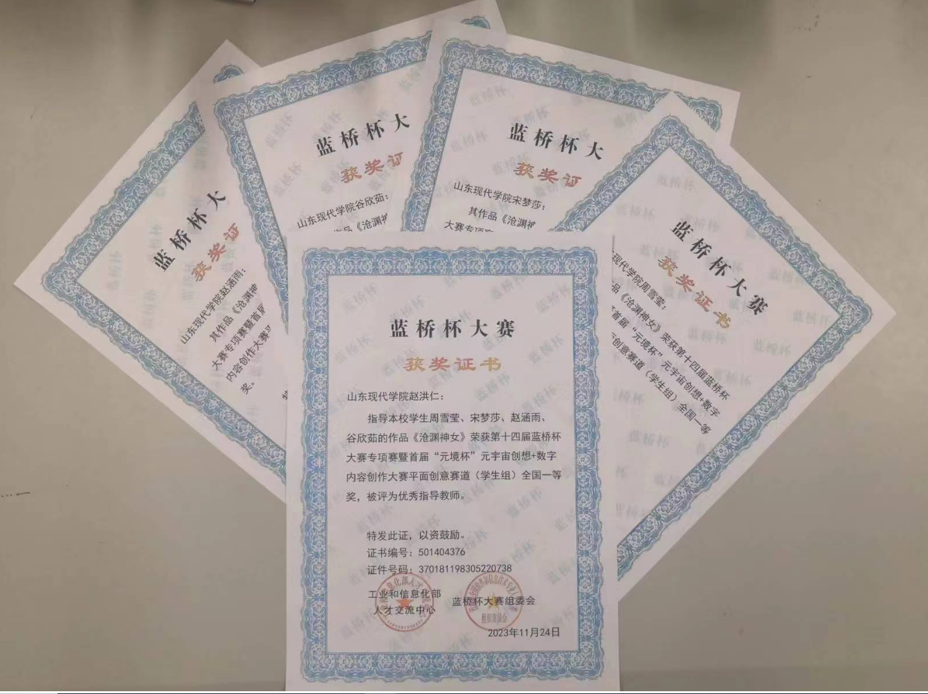 近日,我校收到来自工业和信息化部人才交流中心和蓝桥杯大赛组委会颁发的荣誉证书,对我校在第十四届蓝桥杯大赛专项赛暨首届“元境杯”元宇宙创想+数字内容创作大赛中的优异表现进行表彰,其中,我校学子周雪莹、谷欣茹、宋梦莎、赵涵雨荣获国家一等奖。