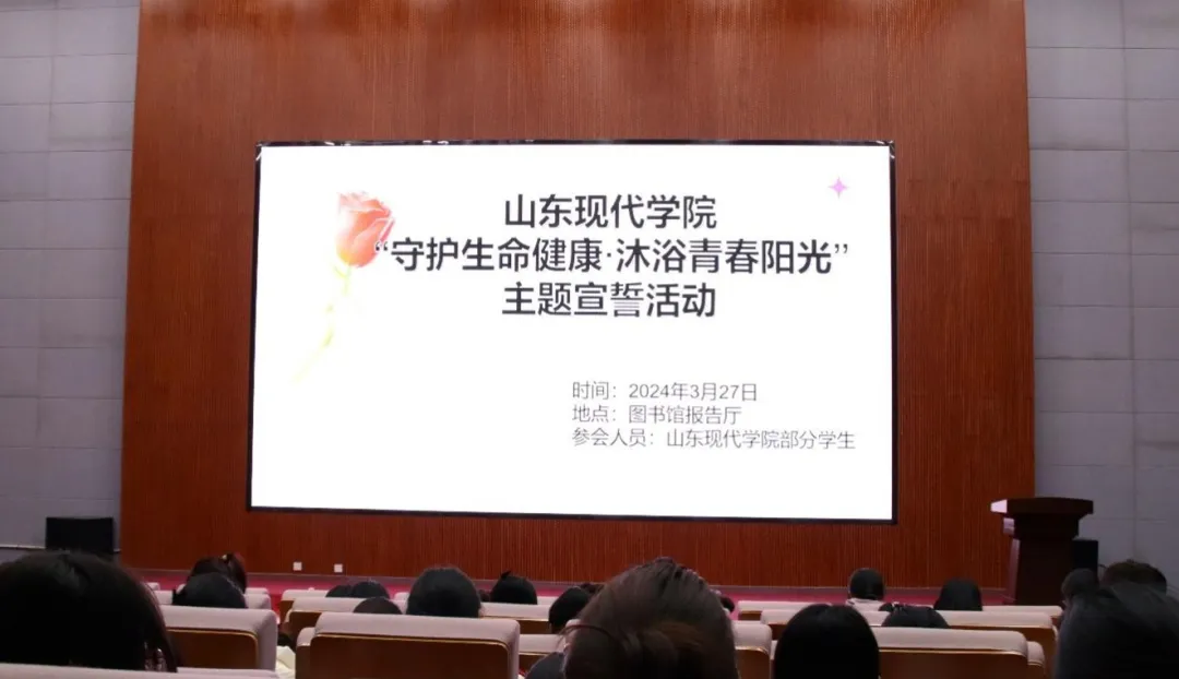 守护生命,健康同行。为进一步贯彻落实《“健康中国2030”规划纲要》要求,营造关爱生命,助力健康的良好校园文化氛围,提高健康水平,促进学生全面发展,3月27日,由共青团山东现代学院委员会主办,青春创业行动指导中心承办的“守护生命健康·沐浴青春阳光”主题宣誓活动在图书馆报告厅举办。