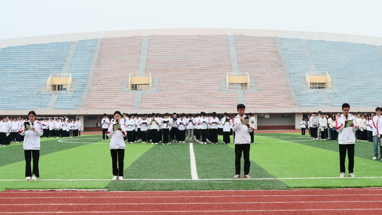 千人齐诵环节,全体学生迅速变换队形,齐诵《大学》。千人诵读的壮观场面令人震撼,同学们的声音回荡在天行健体育场,久久不能散去。