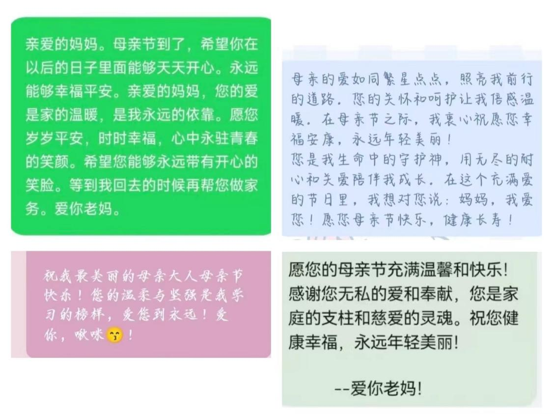 慈影婉转如丝柔,孝心悠长似水流。本次母亲节系列活动的举办,增强了同学们的家庭观念,提高了现代学子的综合素质,在丰富校园文化的同时提升了我校的人文氛围。日后,希望同学们能够更加珍惜母亲的付出和辛劳,增进与母亲之间的情感交流。