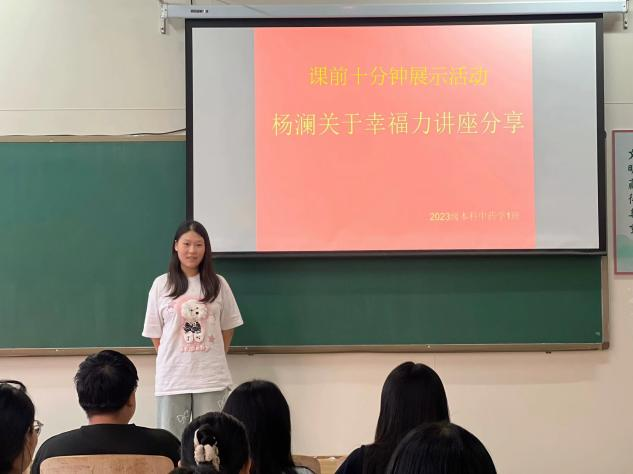 2023级的朱婉嘉同学用生动的语言结合自己的经历阐述了自己关于幸福力的理解。“《幸福力》一书让我明白了幸福并非一蹴而就,而是需要时间和耐心去经营和守护,我们要珍惜现在所拥有的一切,用积极、乐观的心态面对困难和挫折”,此外,她还分享了一些提升幸福力的方法,以帮助同学们提升幸福感。
