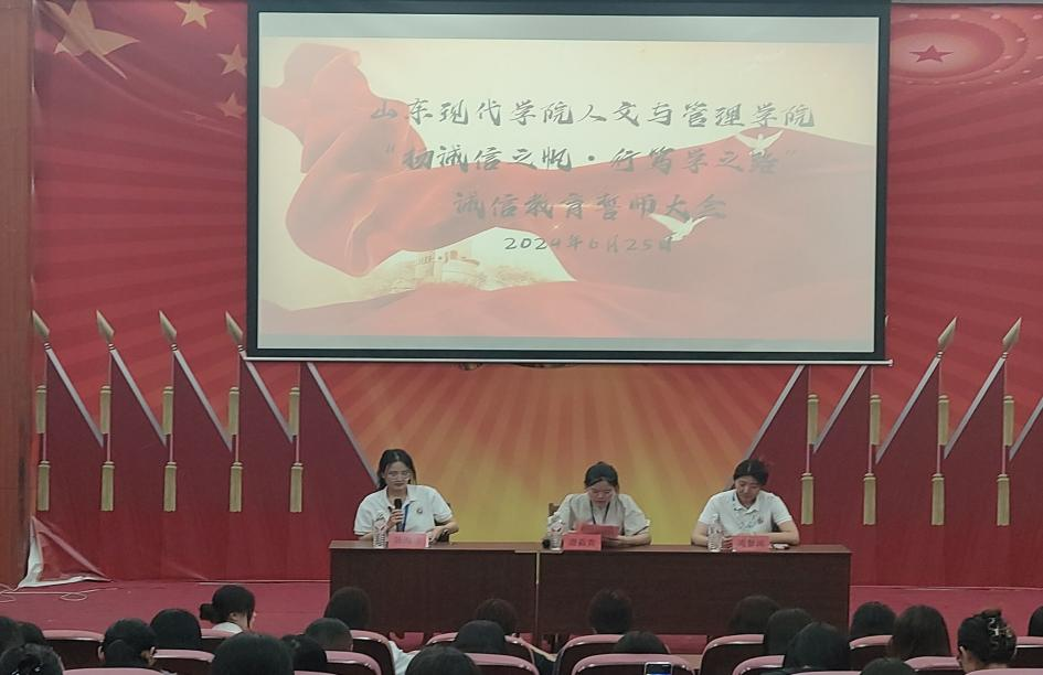 为了引导学生们增强诚信意识,营造良好的诚信氛围,6月25日,由山东现代学院委员会主办,人文与管理学院承办的“扬诚信之帆·行笃学之路”的诚信教育誓师大会在科研楼101室举办。