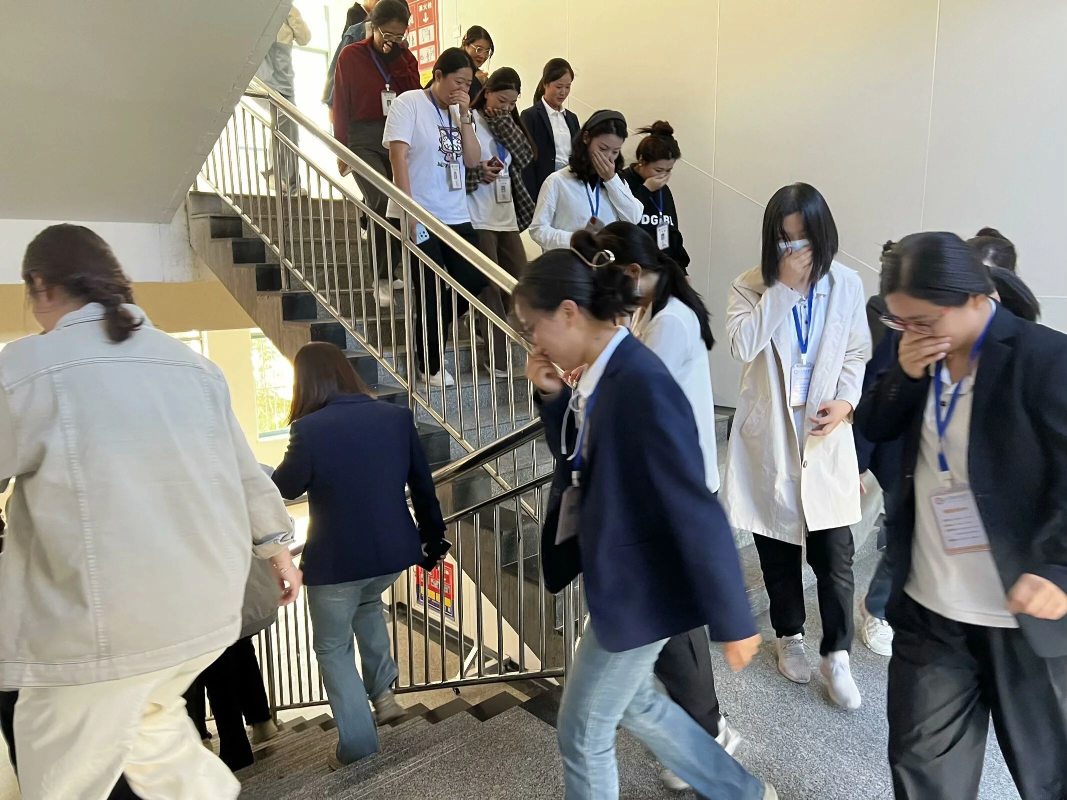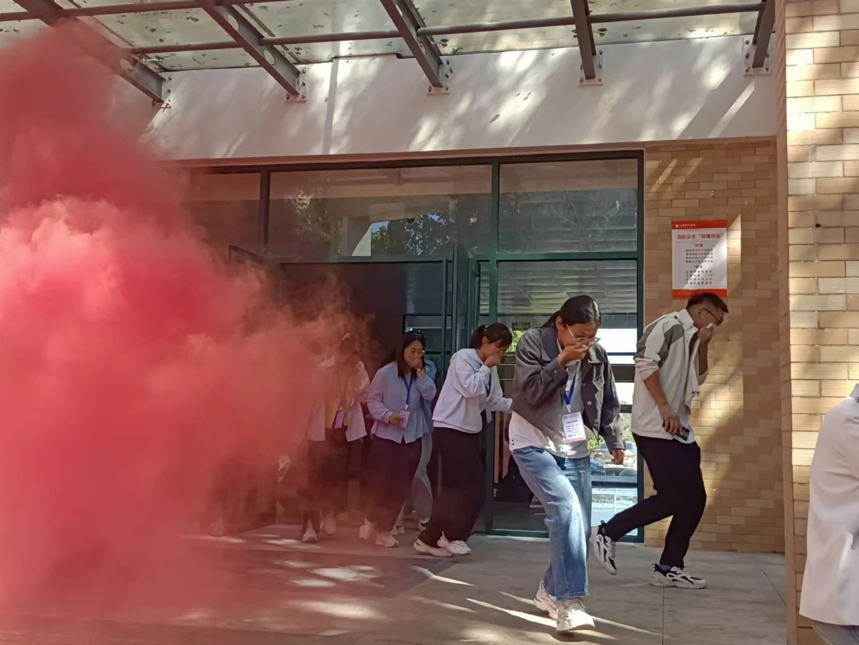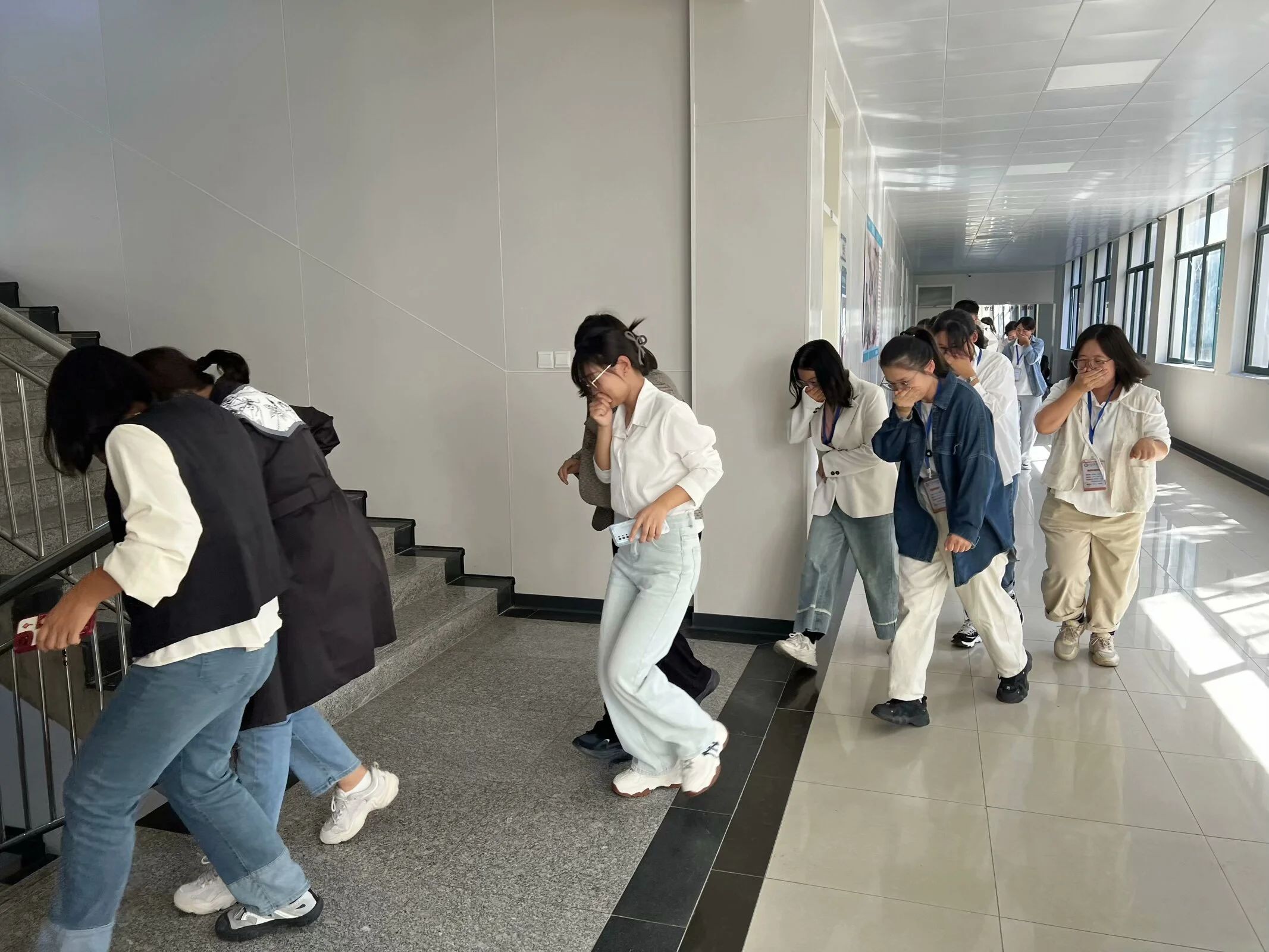 随着警报声响起,消防安全演练正式开始。师生们迅速行动,按照预定的疏散路线有序撤离。疏散过程紧张而有序,大家用湿毛巾捂住口鼻,弯腰低姿前行。到达安全区域后,各负责人及时清点人数,确保所有人员安全撤离。