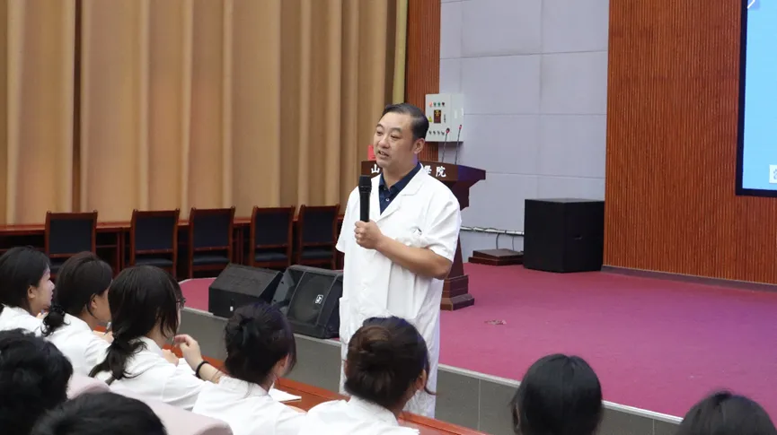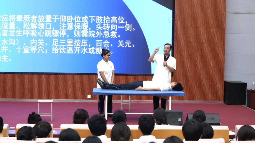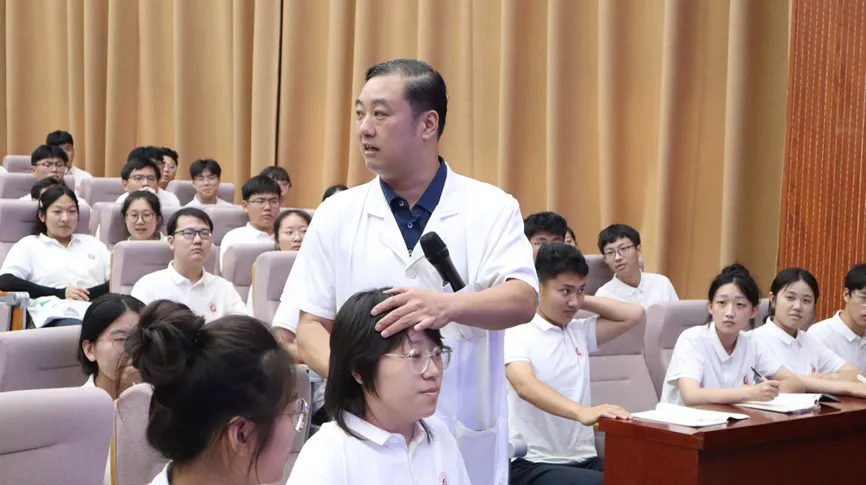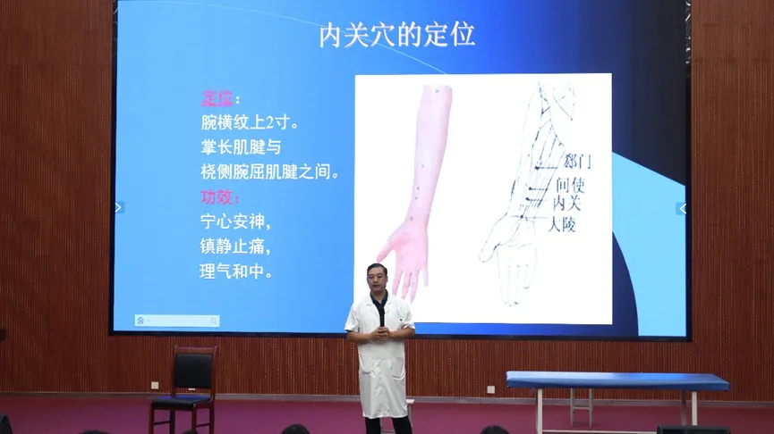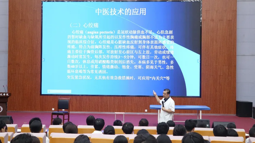 王元鹏教授首先深入探讨了行为方式和人生目标对健康的影响,详细阐述了健康与生活方式之间的紧密联系,并强调了健康的重要性。随后,他从突发的各种特殊病情以及治疗方案出发,现场演绎,与同学们积极互动,为现代学子们展示治疗方式,传授中医文化。最后,王教授向在场学子发出倡导,希望同学们能以中医文化为基础,学以致用,养成良好习惯,传承好中医文化。