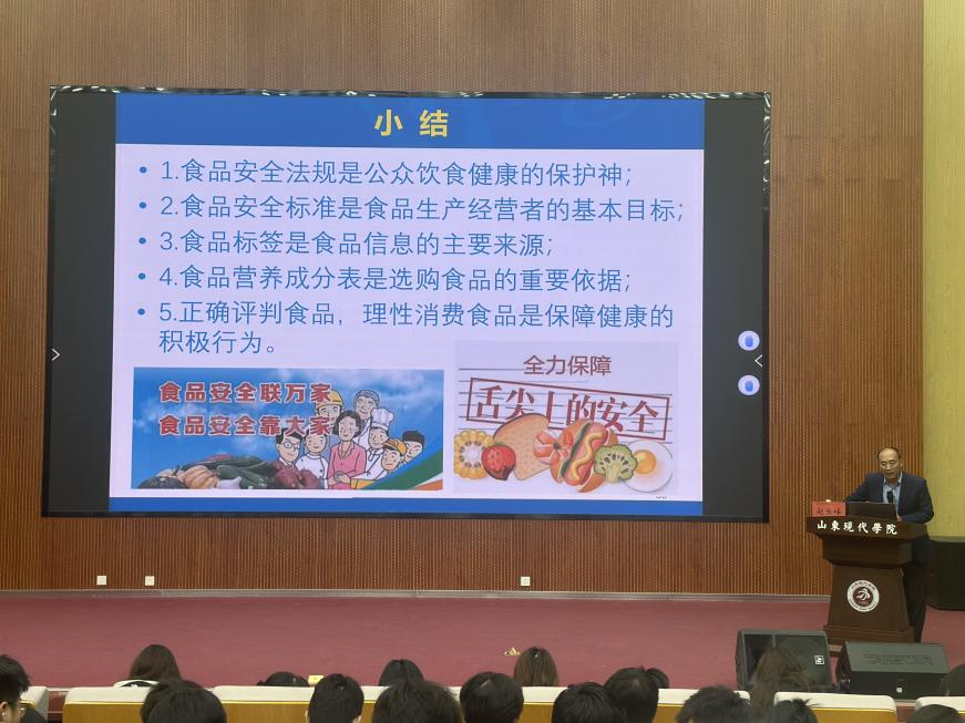 赵长峰院长首先讲解了《中华人民共和国食品安全法》的重要性,并介绍了食品标准的分类,包括国家标准、行业标准、地方标准和企业标准。随后,他强调了正确解读营养成分表的重要性,并建议师生在购买食品时仔细阅读,以便做出科学的选择。最后,赵院长还讲解了食品标签上的其他重要信息,如生产日期、保质期、食品添加剂等,鼓励师生养成查看食品标签的习惯,提高自我保护能力。