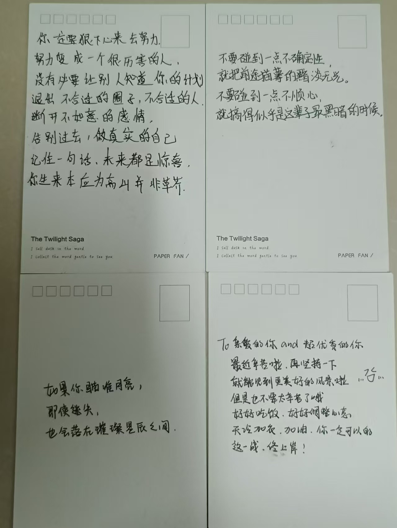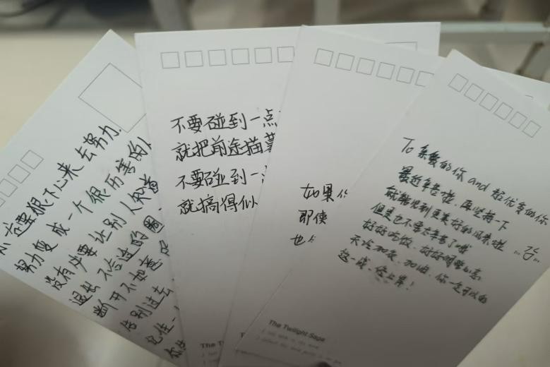 活动前夕,工作人员提前购买了精致的手写明信片。随后,工作人员组织大家拿起笔,在明信片上写下对同窗的祝福以及励志的话语,字里行间都流露着真挚的情感。一位同学摘抄了《人民日报》的金句:“‘失之东隅,收之桑榆’回头看,轻舟已过万重山;向前看,前路漫漫亦灿灿。”他表示自己时常用这句话勉励自己,希望同样能给他人带来力量。