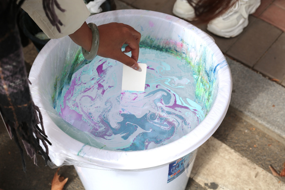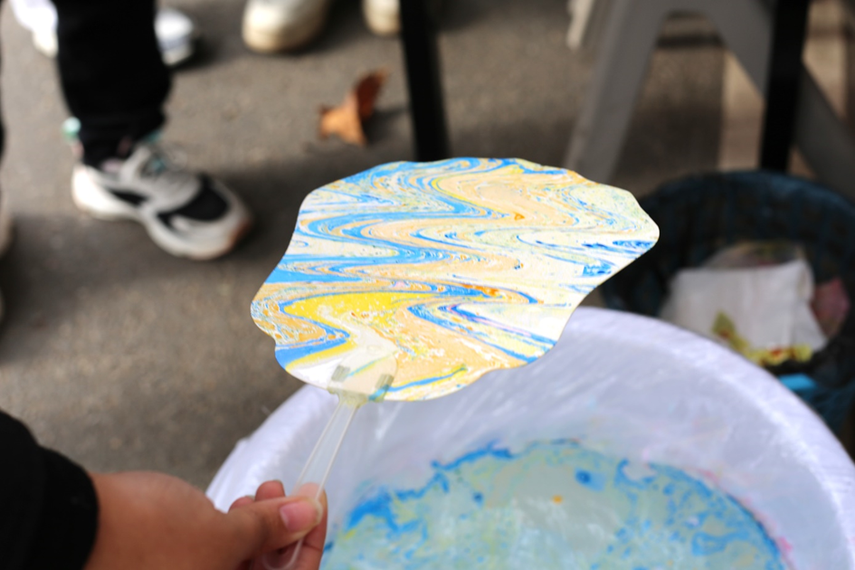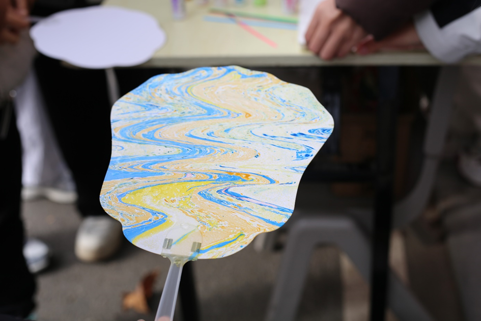 制作环节,同学们了解了漆扇制作的基本步骤和技巧后,拿起材料,开始了漆扇的制作。他们从漆扇的选型开始,经过精心调配漆料后,扇面轻轻划过水中,呈现独具特色的波纹,制作出一把把精美的漆画扇子。