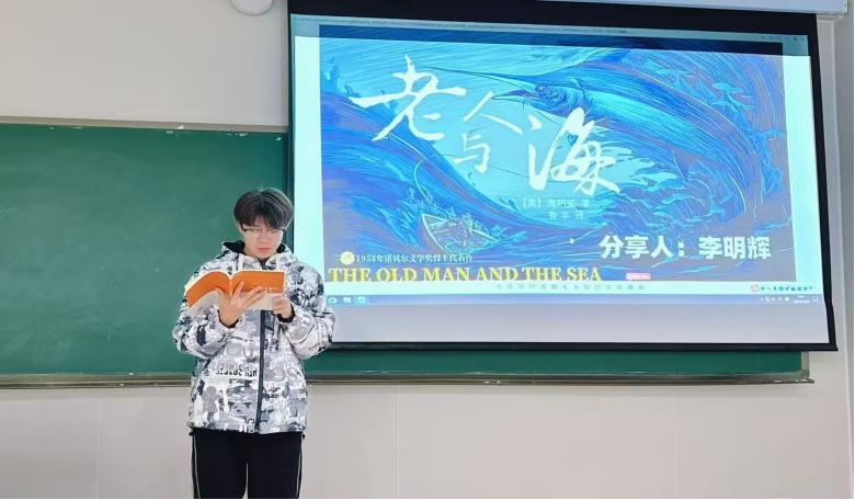 2024级本科护理学1班李明辉同学分享了阅读海明威的《老人与海》一书。书中描绘了老渔夫在浩瀚大海中与凶猛马林鱼展开斗争,尽管历经艰辛最终只带回一副鱼骨,但他不屈不挠的精神却激励着大学生读者勇于直面困境,战胜挑战。