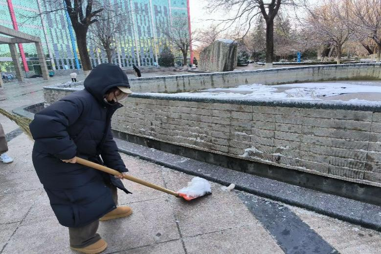 在学院领导和老师的带领下,志愿者们在博学楼下集合完毕。他们手持扫帚、铁锹等工具,纷纷开始除雪。他们分工明确,一部分人负责清扫路面上的积雪,一部分人则专攻结冰区域,用铲子一点点凿开冰层,确保道路畅通无阻。