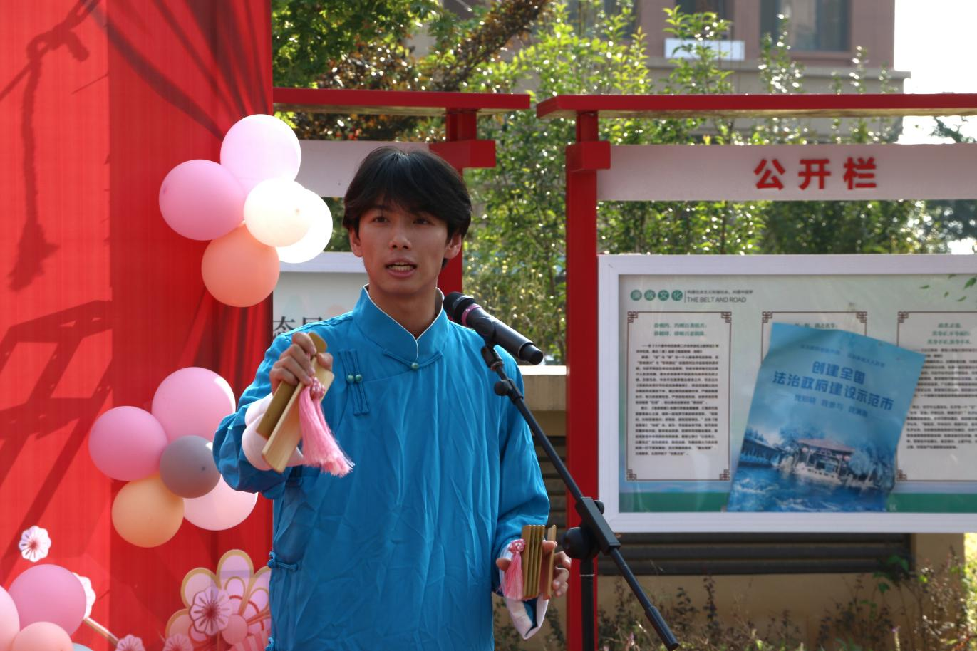 文艺表演在快板《十八愁》中正式拉开帷幕。表演者身着整齐服饰,精神抖擞,手持快板,明快铿锵的节奏响彻广场。“数九寒天冷风嗖,转年春打六九头,正月十五龙灯会,有一对狮子滚绣球”,开篇几句便将年俗典故娓娓道来,唱腔稳中带美,尽显传统曲艺的独特韵味。