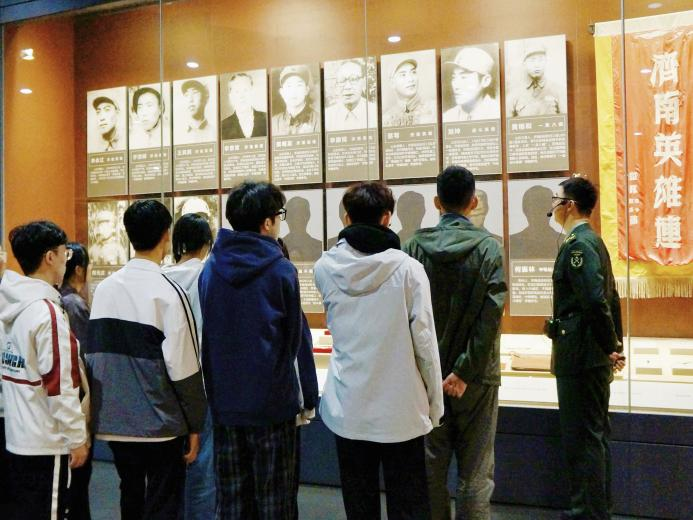 “烈士忠魂,日月同辉”八个鎏金大字悬挂于展厅墙面,字字千钧,震撼着在场每一位同学的心灵。循着讲解的脉络,大家驻足于历史影像前:毛主席与济南革命先辈交流的珍贵留影、“济南英雄连”的鲜红锦旗、英雄们定格青春的旧照一一映入眼帘。当看到部分烈士照片仍为空白时,同学们神情肃穆,对无名英雄的敬畏与缅怀之情油然而生。