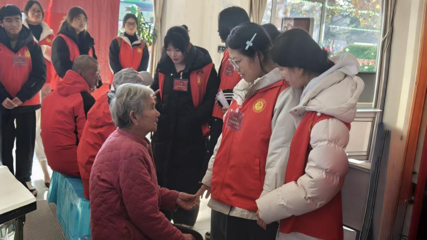 在互动环节中,一位老人主动拉住两名志愿者的手,亲切分享日常生活点滴。志愿者们俯身倾听,耐心交流。这一幕不仅拉近了青年与老年群体的情感距离,搭建起代际沟通的桥梁,也让志愿者们对老年人的生活状态有了更直观、更深入的理解。