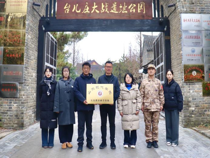 台儿庄作为“中华民族扬威不屈之地”,拥有台儿庄大战纪念馆、大战遗址公园等丰富红色资源,是全国首批“大思政课”实践教学基地。在全体参与人员的共同见证下,校地双方代表共同为“山东现代学院红色研学基地”挂牌。