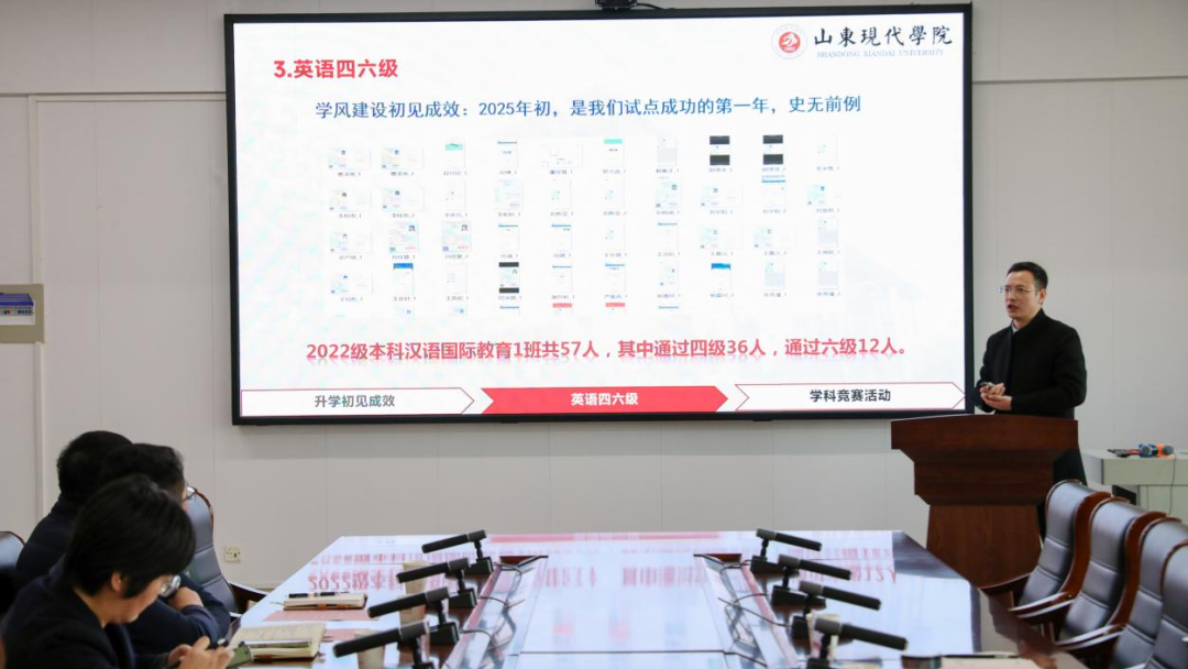文创商学院常务副院长房昌盛汇报了以试点班级带动全院学风建设的做法。2022级汉语国际教育1班在孙素素老师指导下,英语四六级通过率达到84.2%;以此为基础在全院推广的英语打卡活动,本科、专科学生参与率分别达80%和75%,有效促进了学习风气的整体提升。