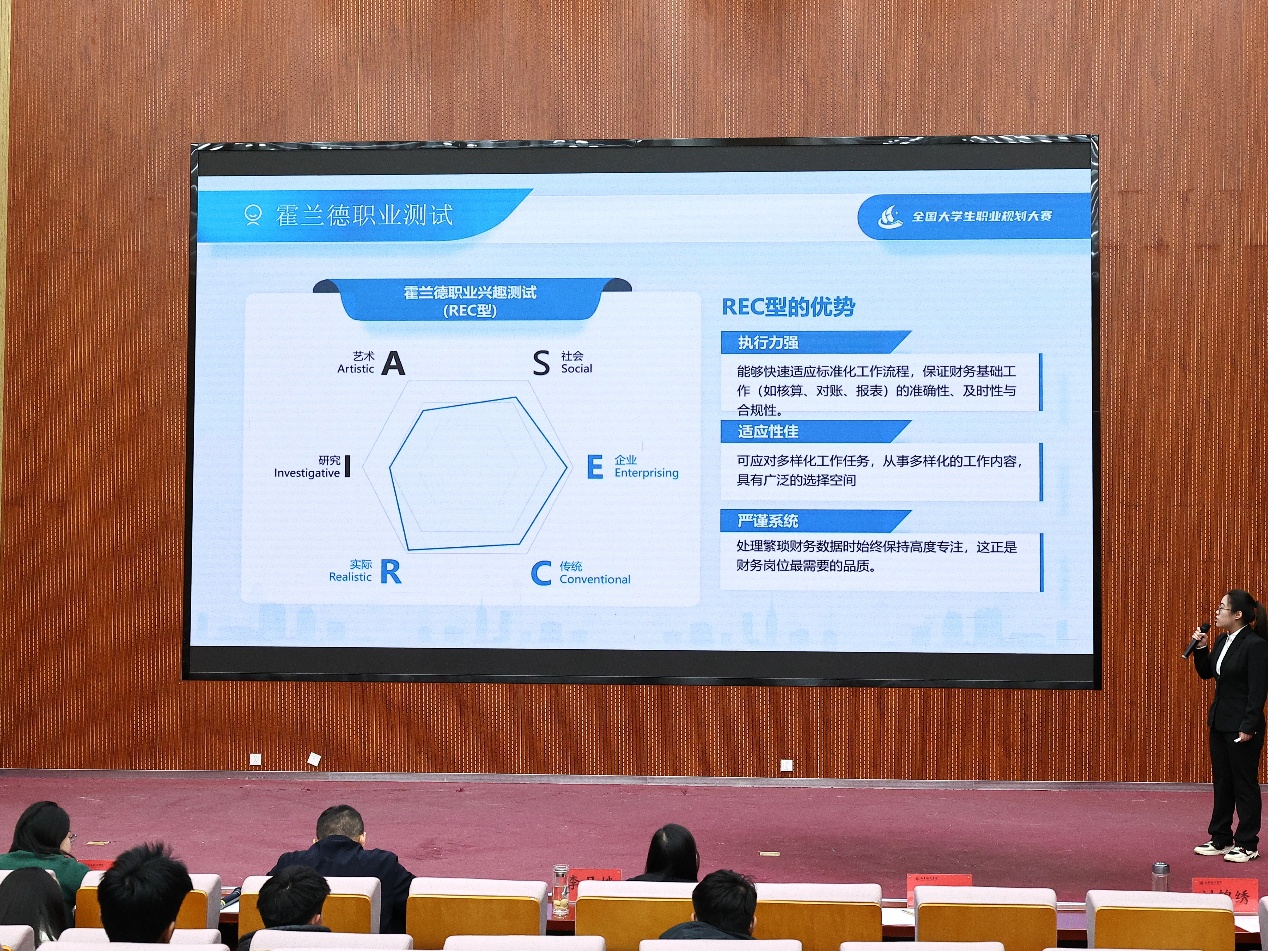 比赛现场,参赛选手按序登台进行职业规划展示,他们紧扣职业发展方向这一核心,从职业分析、目标设定、实施路径到风险应对等维度层层展开阐述,不仅精准结合了当下行业发展趋势,更充分挖掘自身专业优势与个人特质,将职业规划与专业匹配度、职业适配性深度融合。